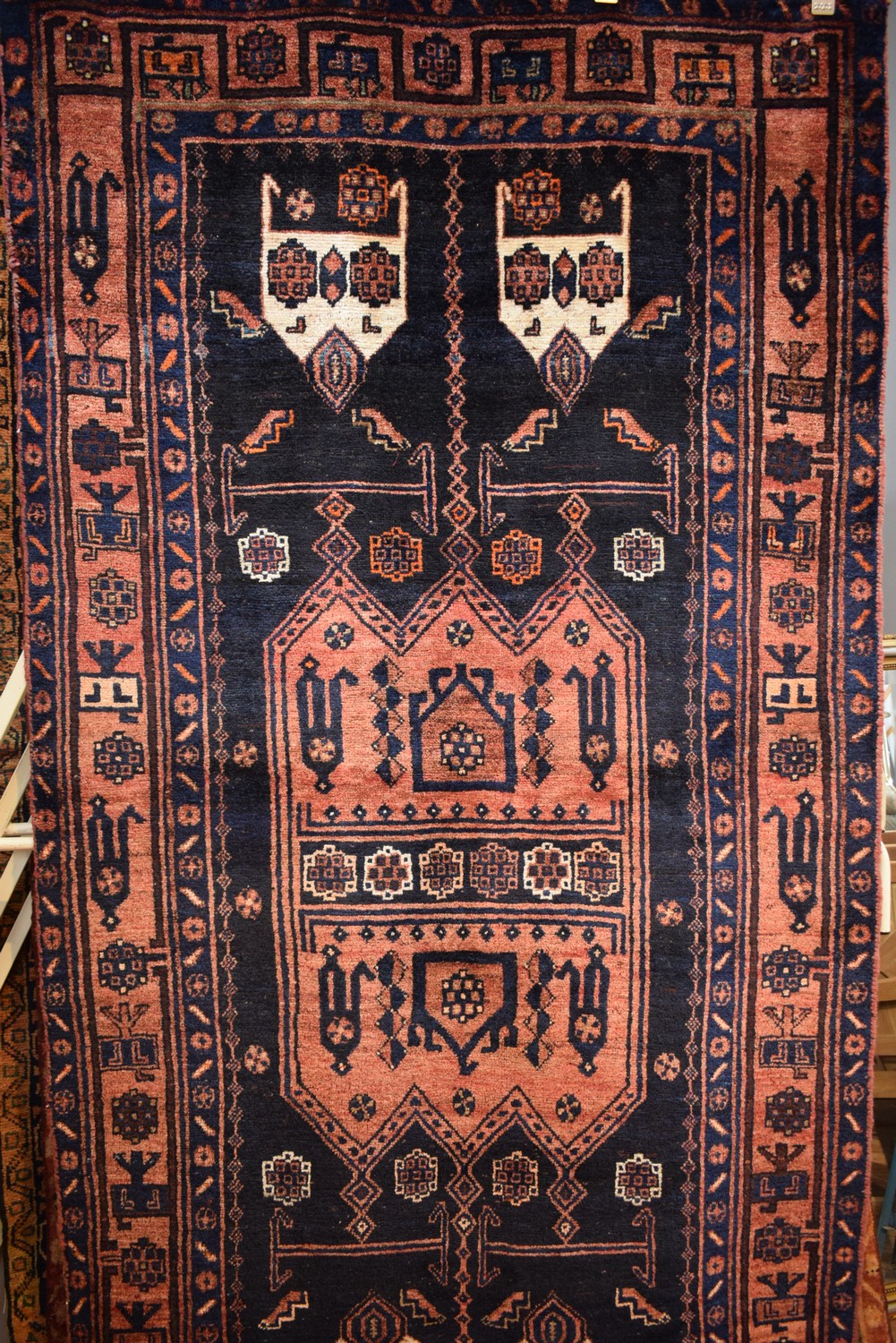 A FABULOUS 1970'S PERSIAN SONQOR BIDJAR TRIBAL RUG. SOLID AND DENSE. NATURAL DYES.TRIBAL DESIGN OF MEDALLION SET WITHIN A FIELD OF TRIBAL PATTERNS ON A CHARCOAL BACKGROUND. CERTIFICATE OF AUTHENTICITY INCLUDED. SIZE: 246X125CM ORIGIN: PERSIA - RRP: $2,900