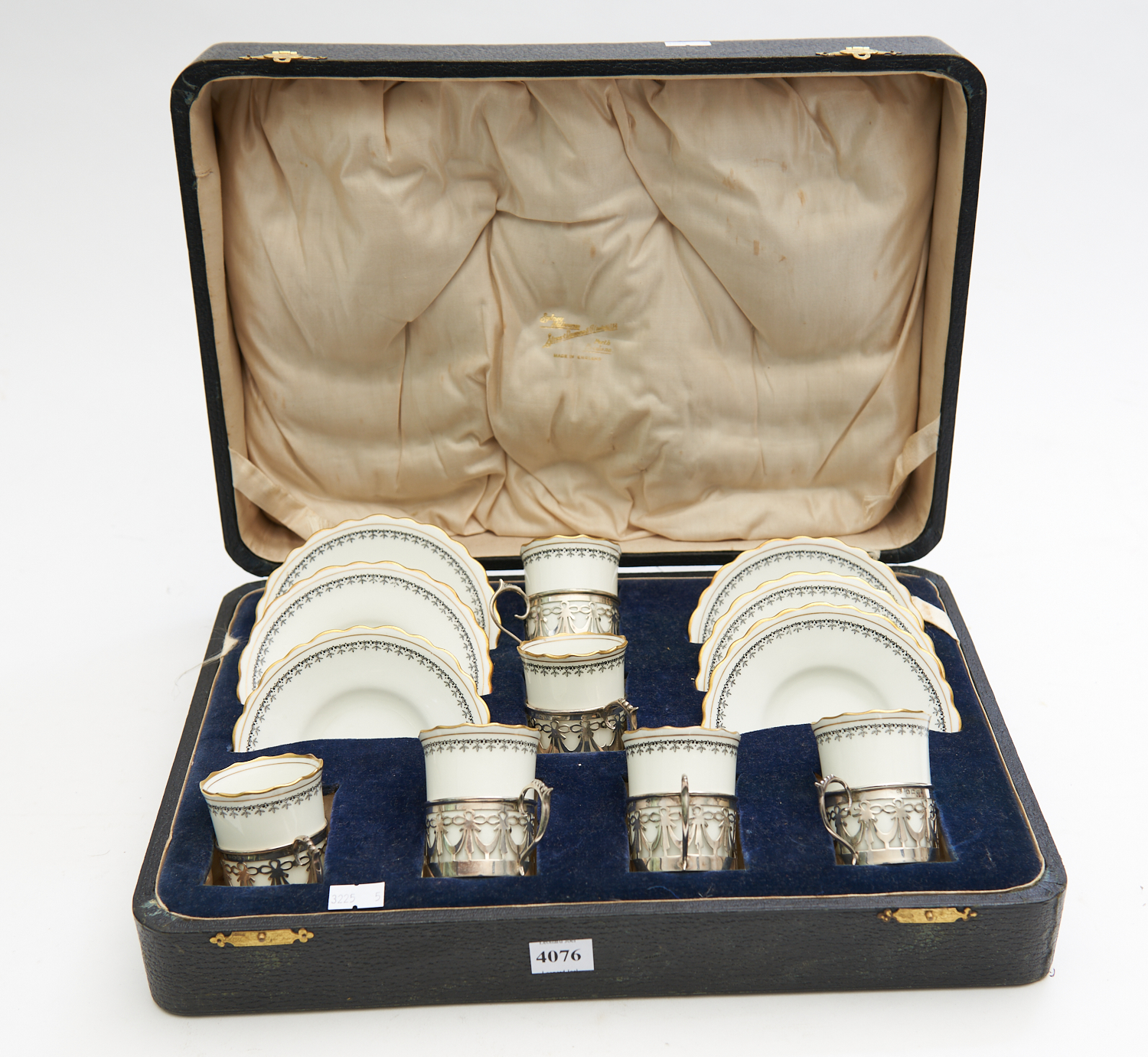 AN AYNSLEY DEMITASSE TEA SET FOR SIX WITH STERLING SILVER HOLDERS (A/F), LEONARD JOEL LOCAL DELIVERY SIZE: SMALL