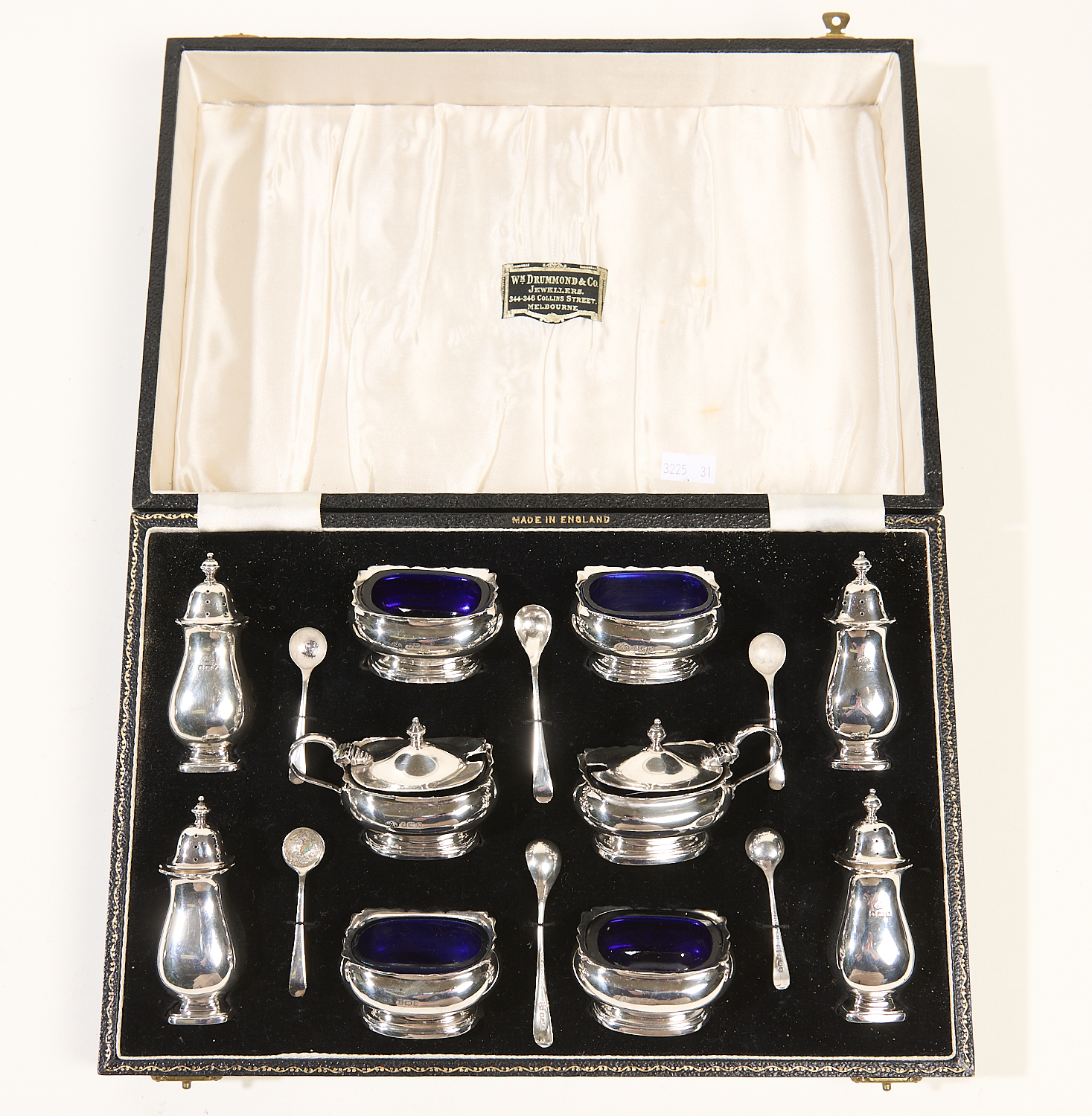 A MATCHED STERLING SILVER CRUET SET IN BOX WITH SILVER PLATED SPOONS AND ONE SILVER PLATED PEPPER SHAKER, LEONARD JOEL LOCAL DELIVERY SIZE: SMALL