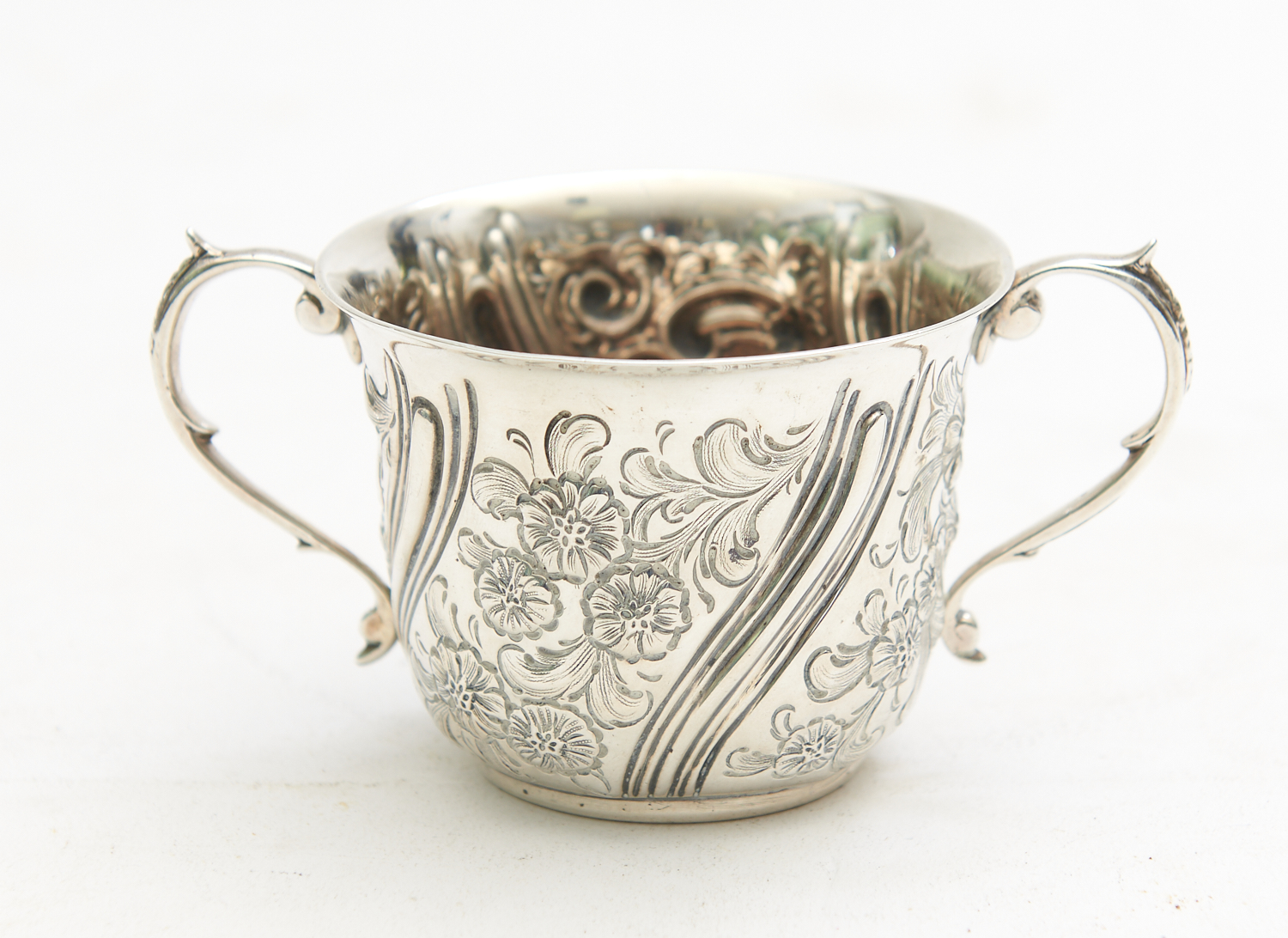 A STERLING SILVER TWO HANDLED CHRISTENING MUG WITH FLORAL DECORATION AND VACANT CARTOUCHE (H. 8 CM) 109 G, LEONARD JOEL LOCAL DELIVERY SIZE: SMALL