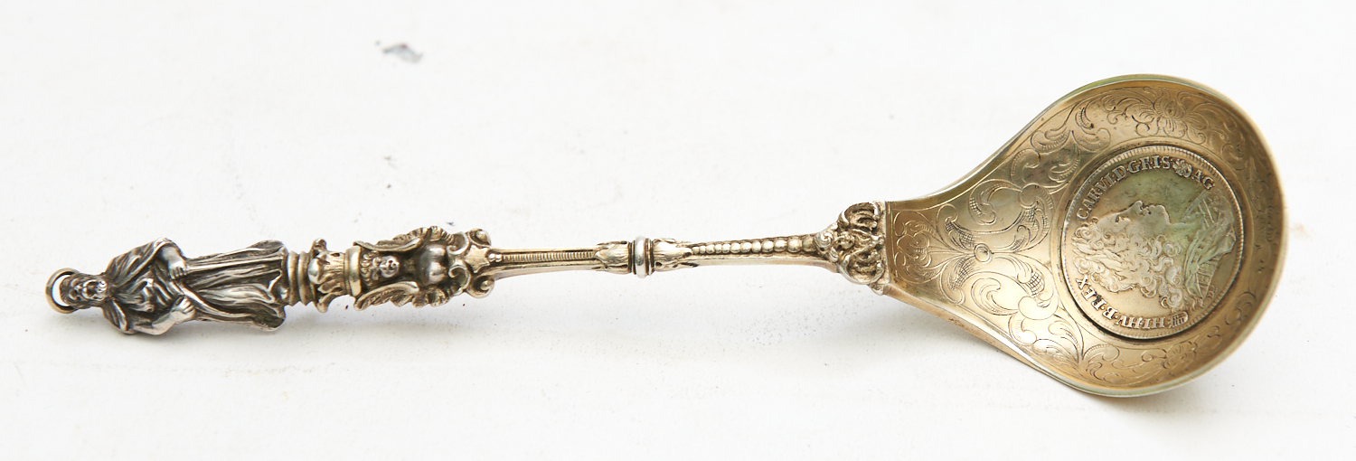 A COIN INSET 800 SILVER SPOON (20 CM W) (88 GRAMS), LEONARD JOEL LOCAL DELIVERY SIZE: SMALL