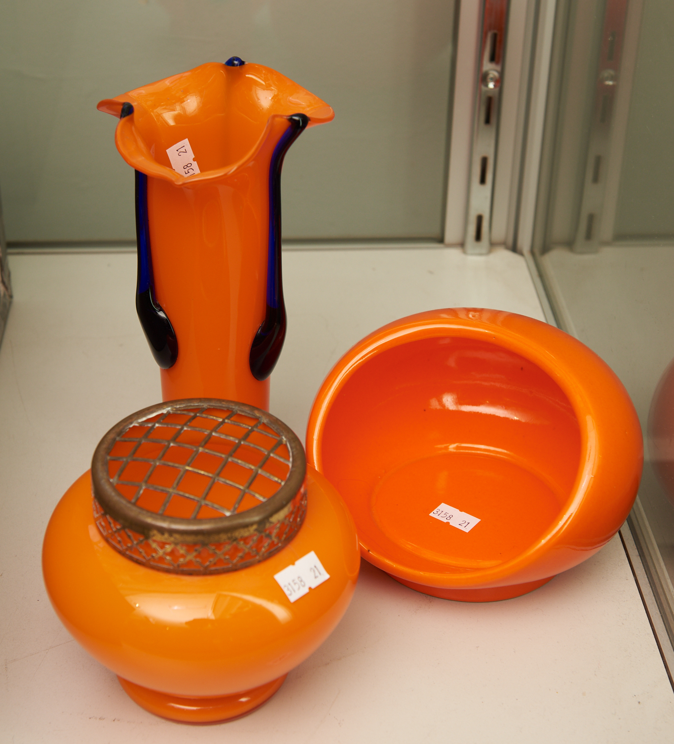 AN ORANGE ROSE BOWL TOGETHER WITH CASED GLASS VASE (A/F) AND CERAMIC BOWL, LEONARD JOEL LOCAL DELIVERY SIZE: SMALL
