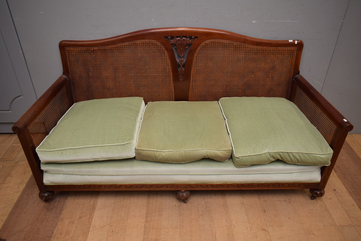 A CARVED TIMBER AND RATTAN SETTEE (A/F) (87H x 185W x 77D CM) (PLEASE NOTE THIS HEAVY ITEM MUST BE REMOVED BY CARRIERS AT THE CUSTOMER'S EXPENSE. LEONARD JOEL STAFF CANNOT ASSIST CARRYING THIS ITEM) (X-LARGE ITEM)