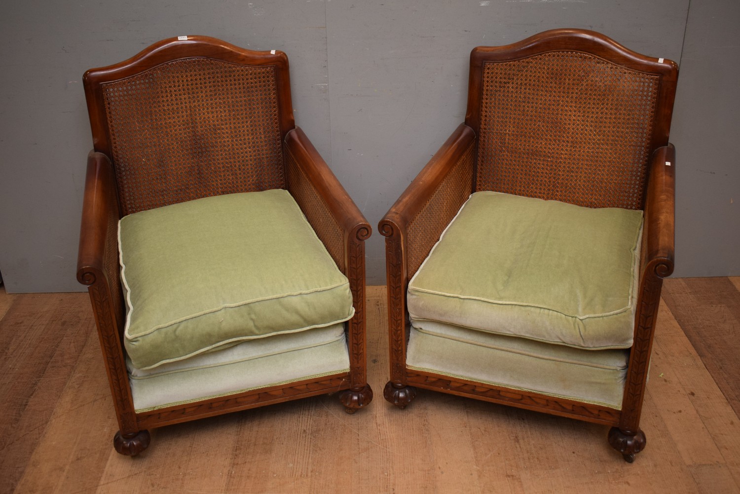 A PAIR OF CARVED TIMBER AND RATTAN ARMCHAIRS (A/F) (94H x 70W x 81D CM) (PLEASE NOTE THIS HEAVY ITEM MUST BE REMOVED BY CARRIERS AT THE CUSTOMER'S EXPENSE. LEONARD JOEL STAFF CANNOT ASSIST CARRYING THIS ITEM) (X-LARGE ITEM)