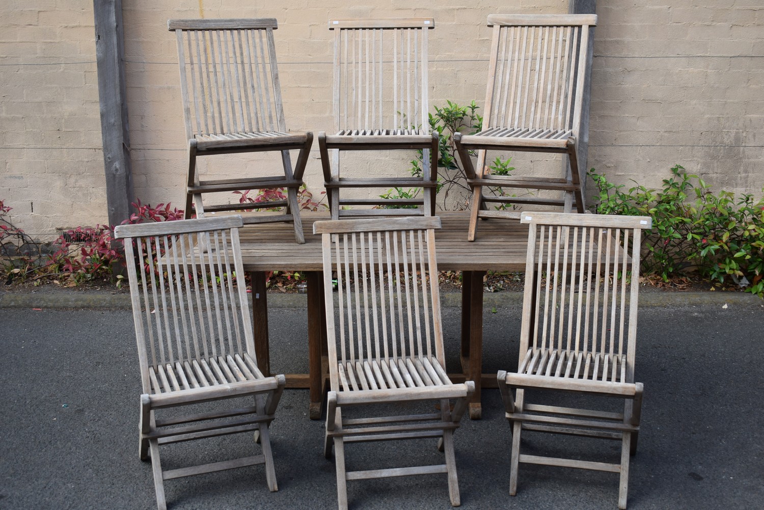 A SEVEN PIECE TEAK OUTDOOR SETTING (70H x 180W x 90D CM) (PLEASE NOTE THIS HEAVY ITEM MUST BE REMOVED BY CARRIERS AT THE CUSTOMER'S EXPENSE. LEONARD JOEL STAFF CANNOT ASSIST CARRYING THIS ITEM) (X-LARGE ITEM)