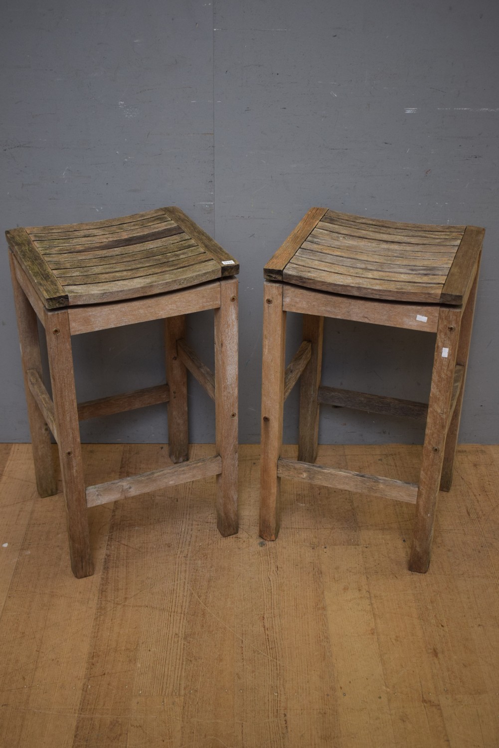 A PAIR OF TEAK BARSTOOLS (75H x 43W x 40D CM) (LEONARD JOEL DELIVERY SIZE: MEDIUM)