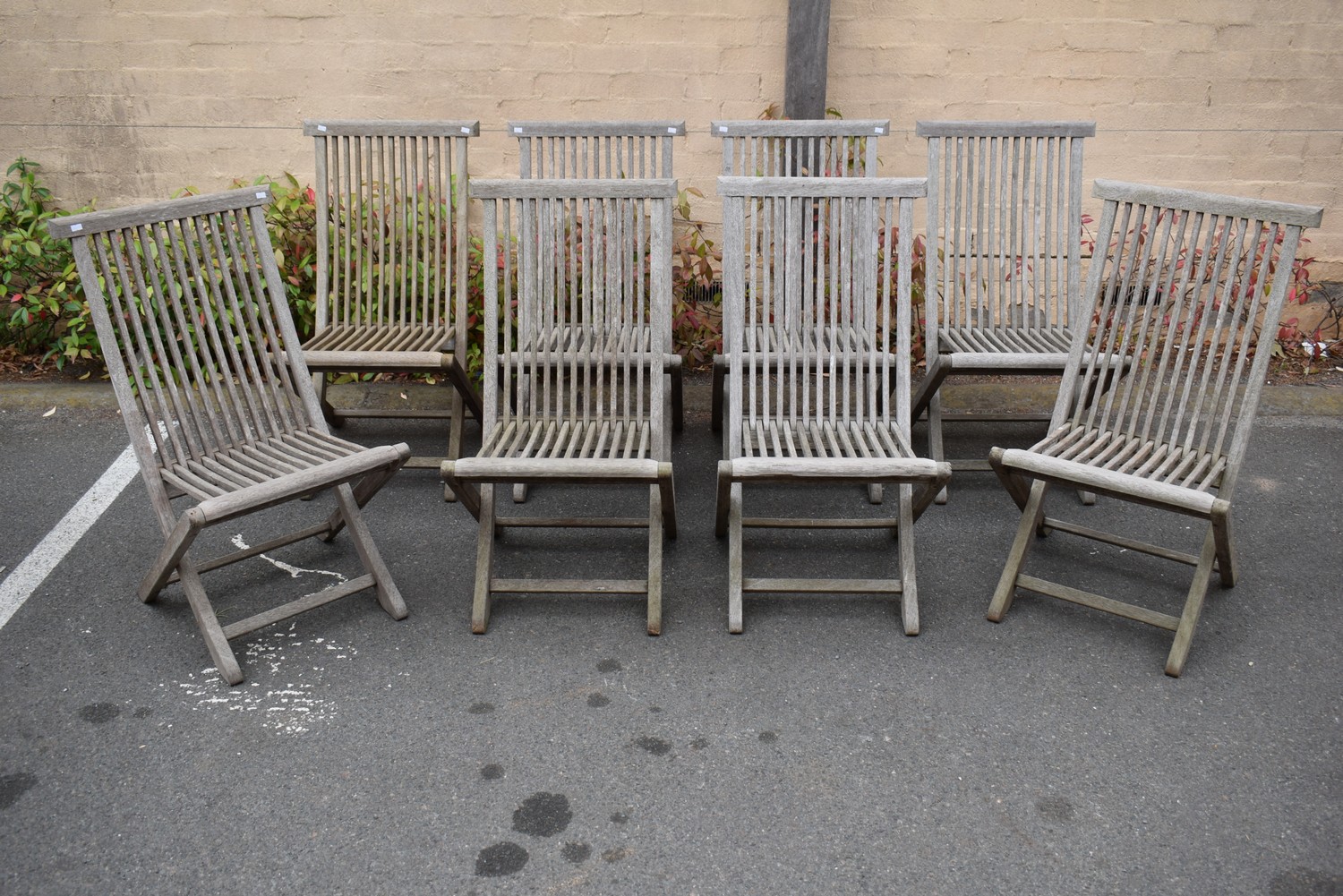 A SET OF EIGHT TEAK FOLDING OUTDOOR CHAIRS (H91 X W50 X D63 CM) (LEONARD JOEL DELIVERY SIZE: LARGE)