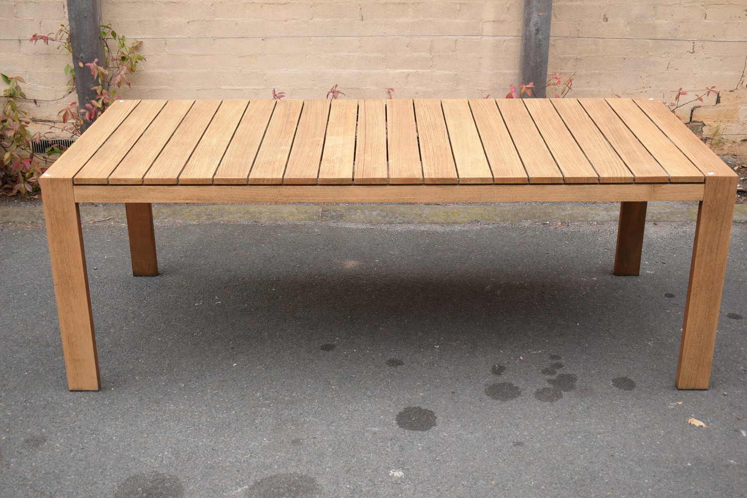 A JATI TEAK OUTDOOR DINING TABLE (A/F) (H74 X W210 X D93 CM) (PLEASE NOTE THIS HEAVY ITEM MUST BE REMOVED BY CARRIERS AT THE CUSTOMER'S EXPENSE. LEONARD JOEL STAFF CANNOT ASSIST CARRYING THIS ITEM) (X-LARGE ITEM)