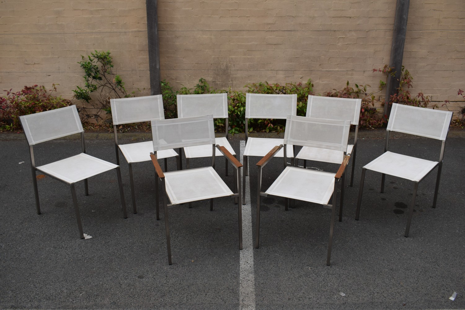 A SET OF EIGHT METAL FRAMED DINING CHAIRS (A/F) (H86 X W48 X D65 CM) (LEONARD JOEL DELIVERY SIZE: LARGE)