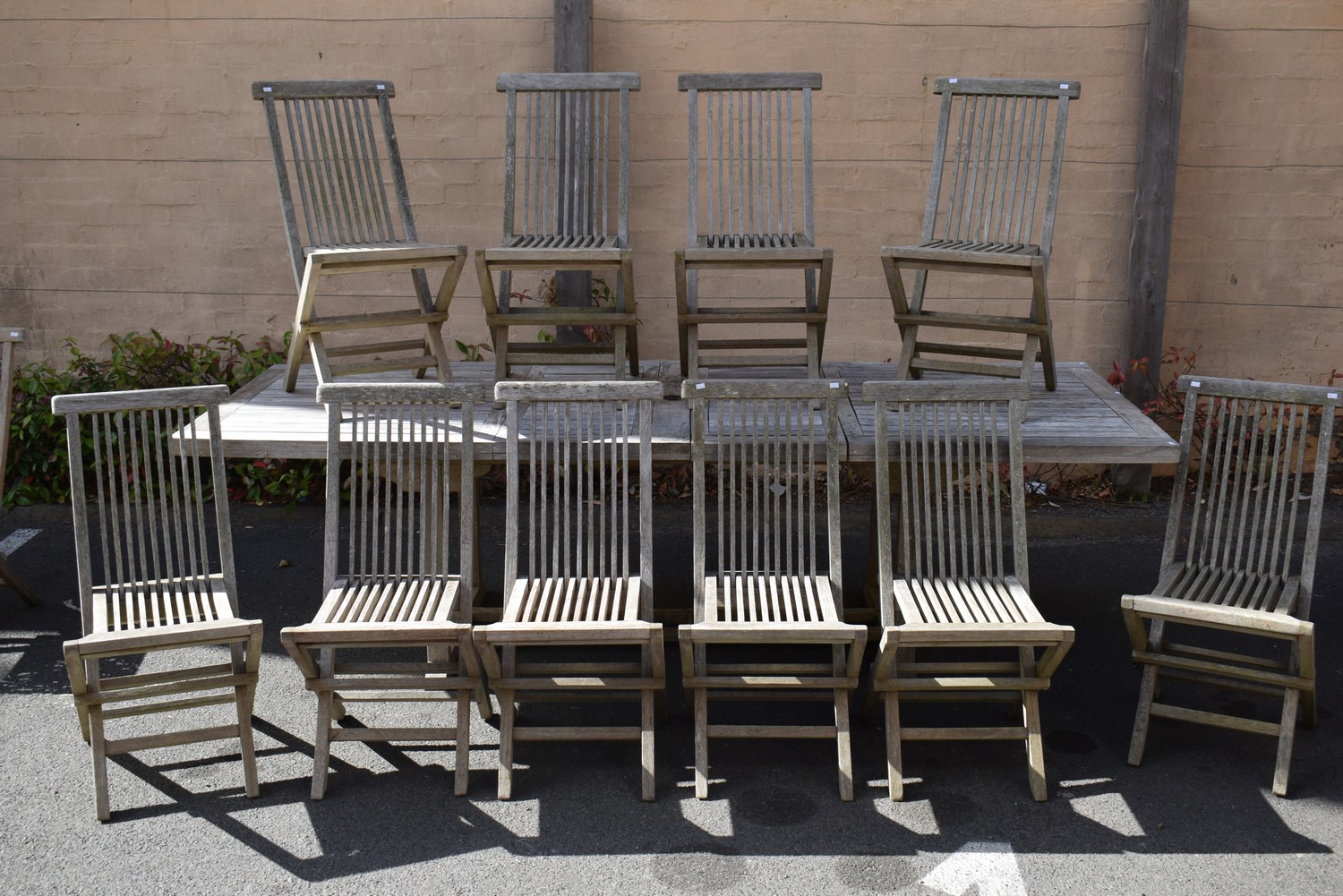 AN ELEVEN PIECE TEAK OUTDOOR SETTING (A/F) (75H x 260W x 100D CM) (PLEASE NOTE THIS HEAVY ITEM MUST BE REMOVED BY CARRIERS AT THE CUSTOMER'S EXPENSE. LEONARD JOEL STAFF CANNOT ASSIST CARRYING THIS ITEM) (X-LARGE ITEM)