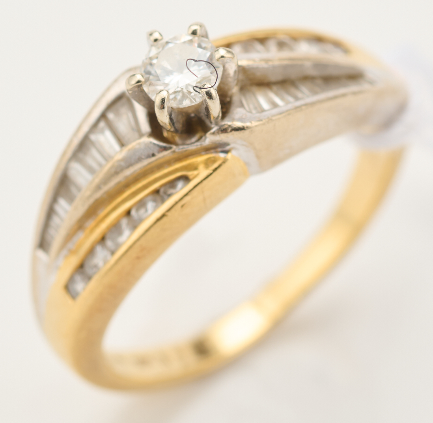 A DIAMOND DRESS RING IN TWO TONE 18CT GOLD, CENTRALLY SET WITH A ROUND BRILLIANT CUT DIAMOND WEIGHING AN ESTIMATED 0.20CTS, RING SIZE M