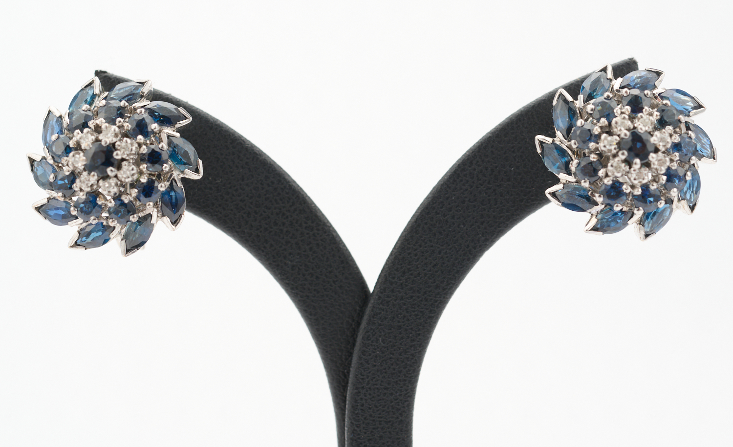 A PAIR OF VINTAGE SAPPHIRE CLUSTER EARRINGS TO CONVERTIBLE POST AND CLIP FITTINGS IN LOW CARAT WHITE GOLD