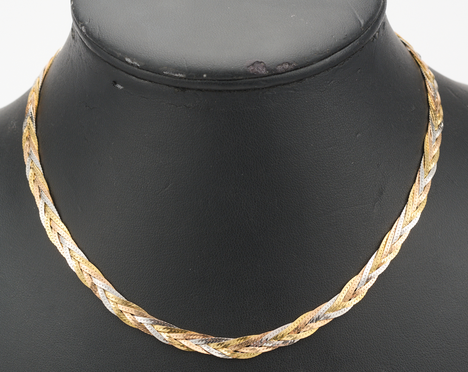 A WOVEN NECKLACE IN TRI COLOUR 14CT GOLD