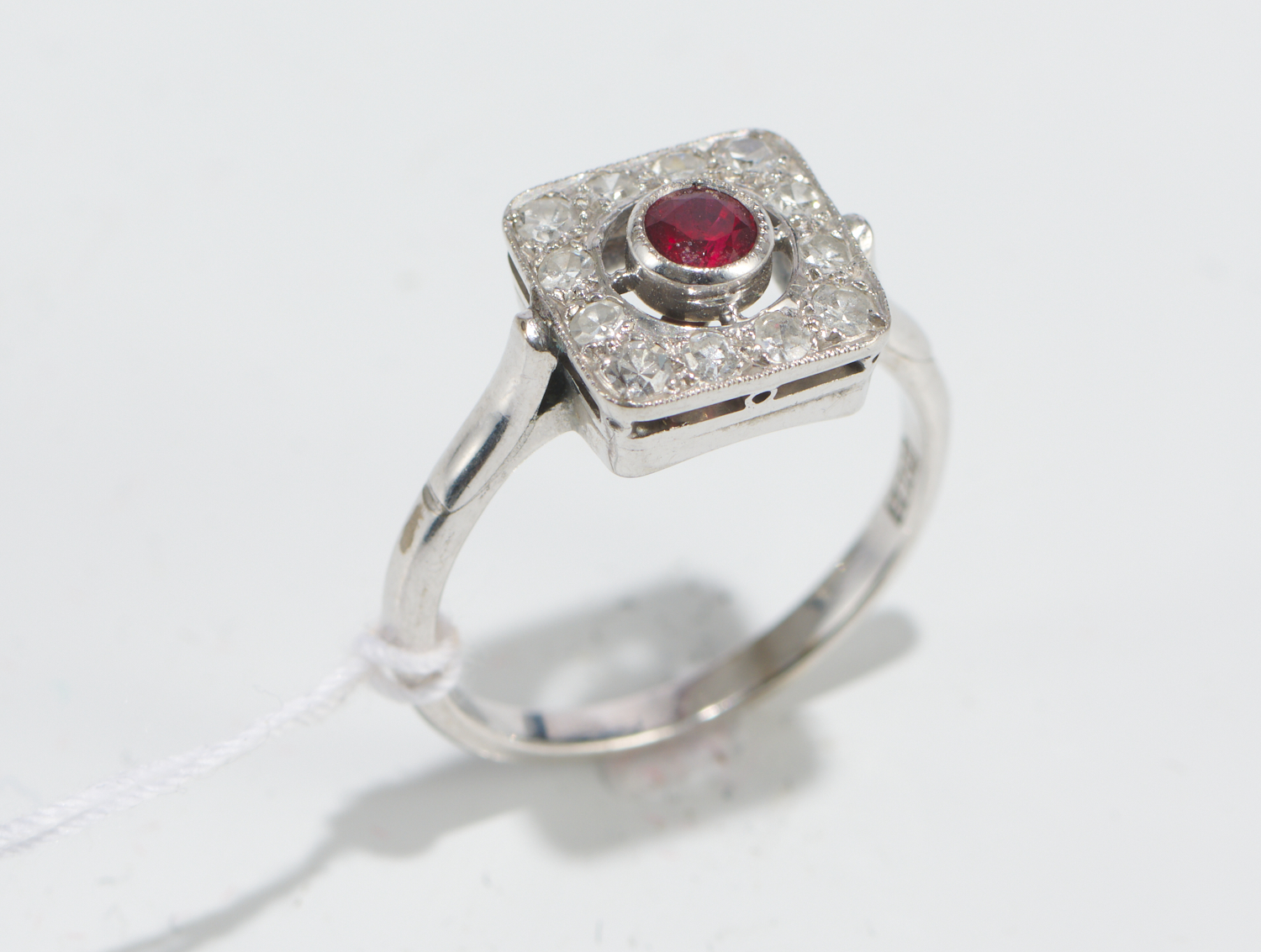 A RUBY AND DIAMOND RING IN 18CT WHITE GOLD, RING SIZE M, 3.0GMS