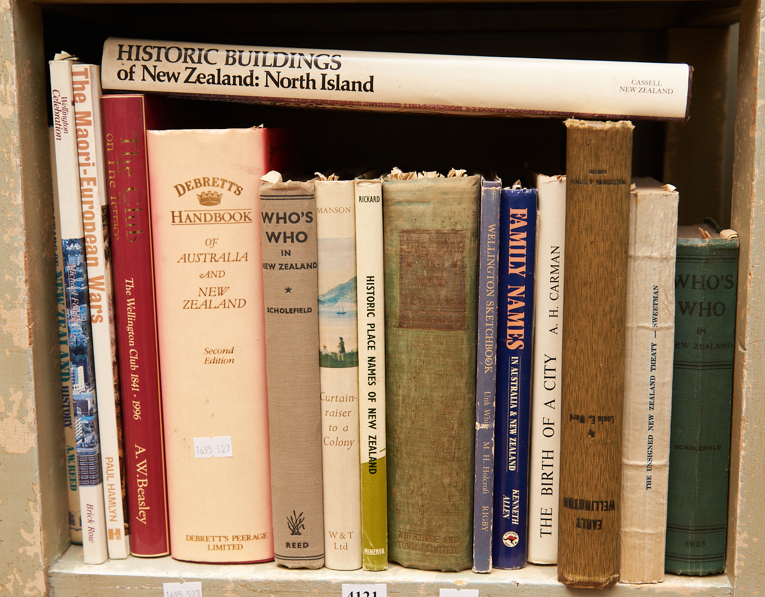A SHELF OF BOOKS PERTAINING TO THE HISTORY OF NEW ZEALAND. The estate of Rodney Permezel