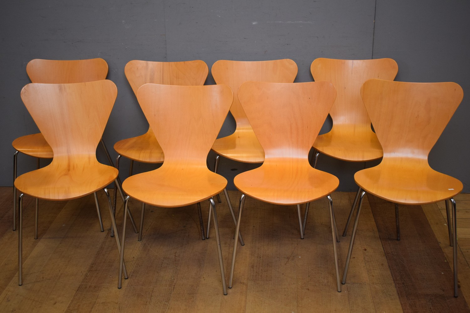 A SET OF EIGHT FRITZ HANSEL STYLE DINING CHAIRS (A/F) (H80 X W51 X D50 CM) (LEONARD JOEL DELIVERY SIZE: LARGE)