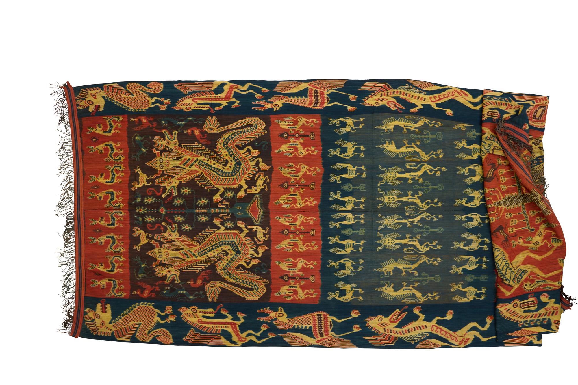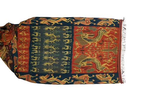 The warp ikat handwoven cloth decorated with multi-headed dragons and other fierce mythical creatures, in natural indigo, madder and yellow dyes.