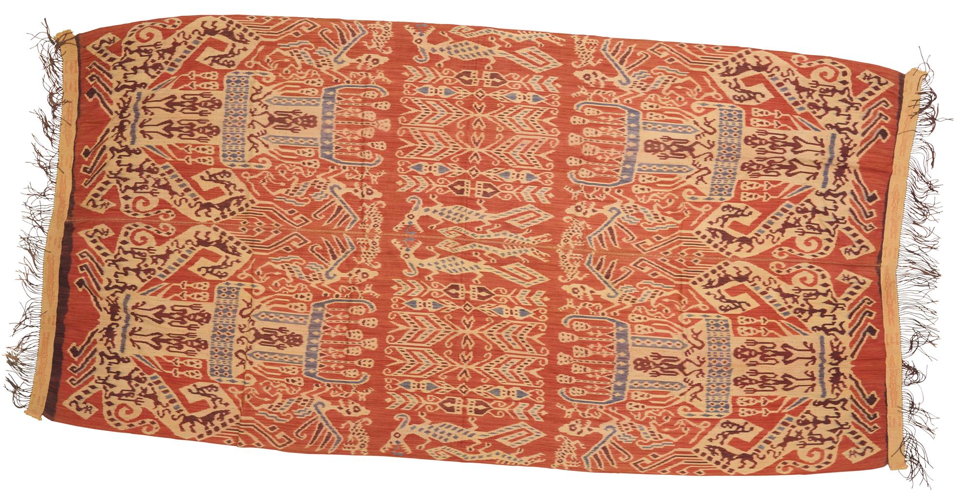The warp ikat cloth with designs of humans and crocodiles, in yellow, red, indigo and brown dyes.