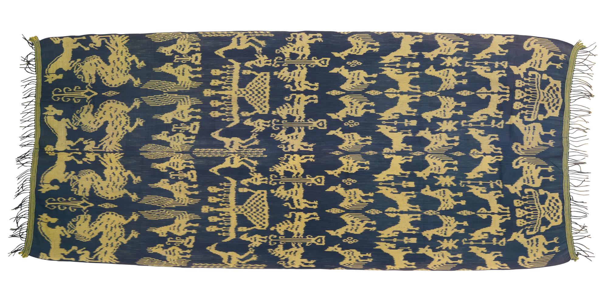 The warp ikat weaving decorated with designs of birds, horses, mythical creatures, in yellow and indigo dyes.