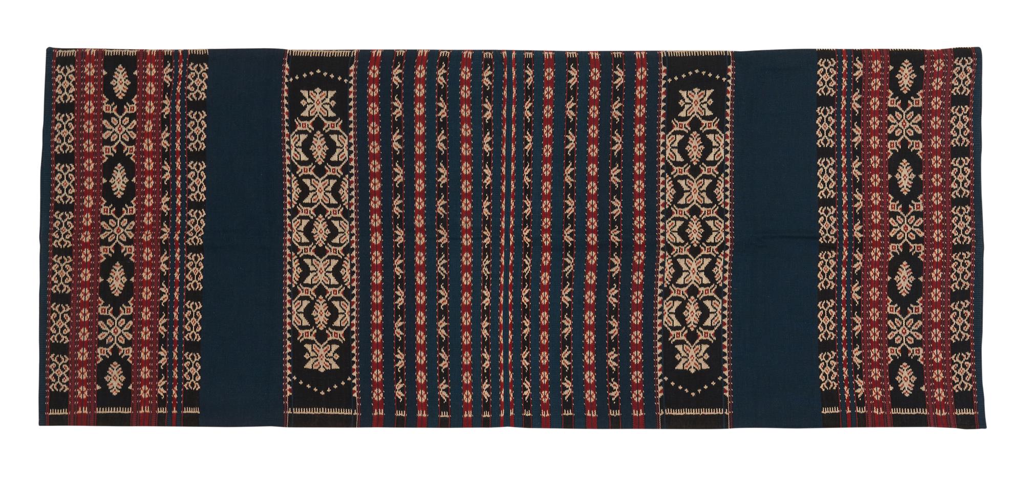 Decorated with stylised floral and foliate motifs, in indigo, red and white natural dyes.