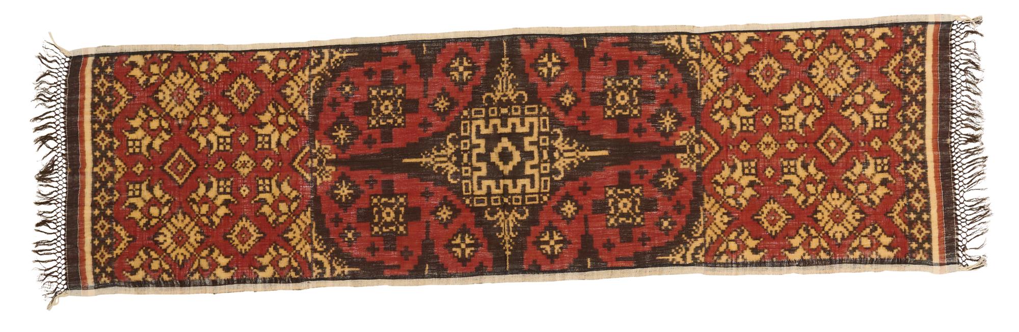 The double ikat hand-loomed ceremonial/ritual cloth with geometric designs in red, yellow and black.
