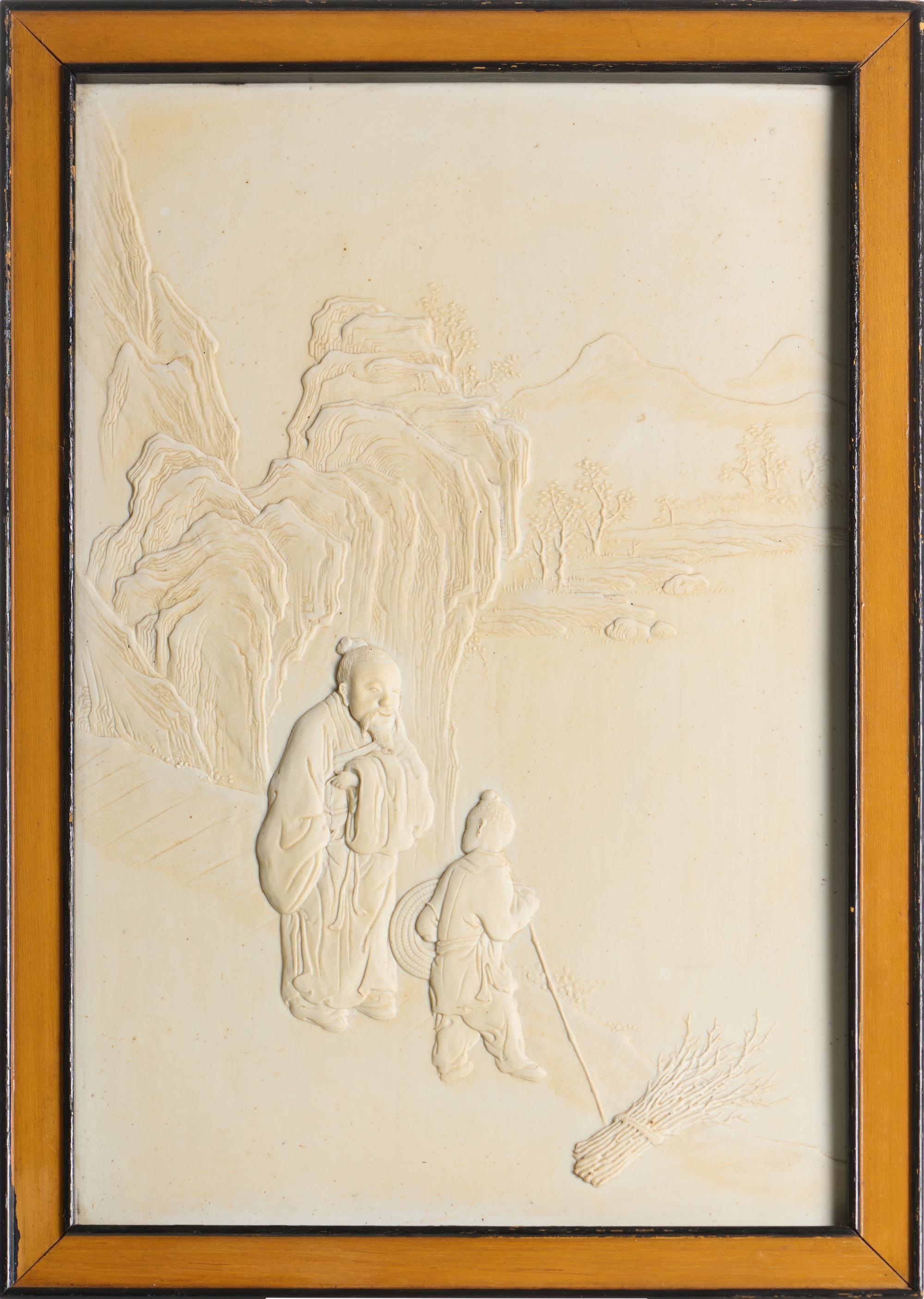 The large unglazed biscuit porcelain plaque with carved and applique decoration of a scholar with boy attendant with mountains and lake in the distance. Housed in a fitted wooden frame.
