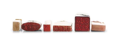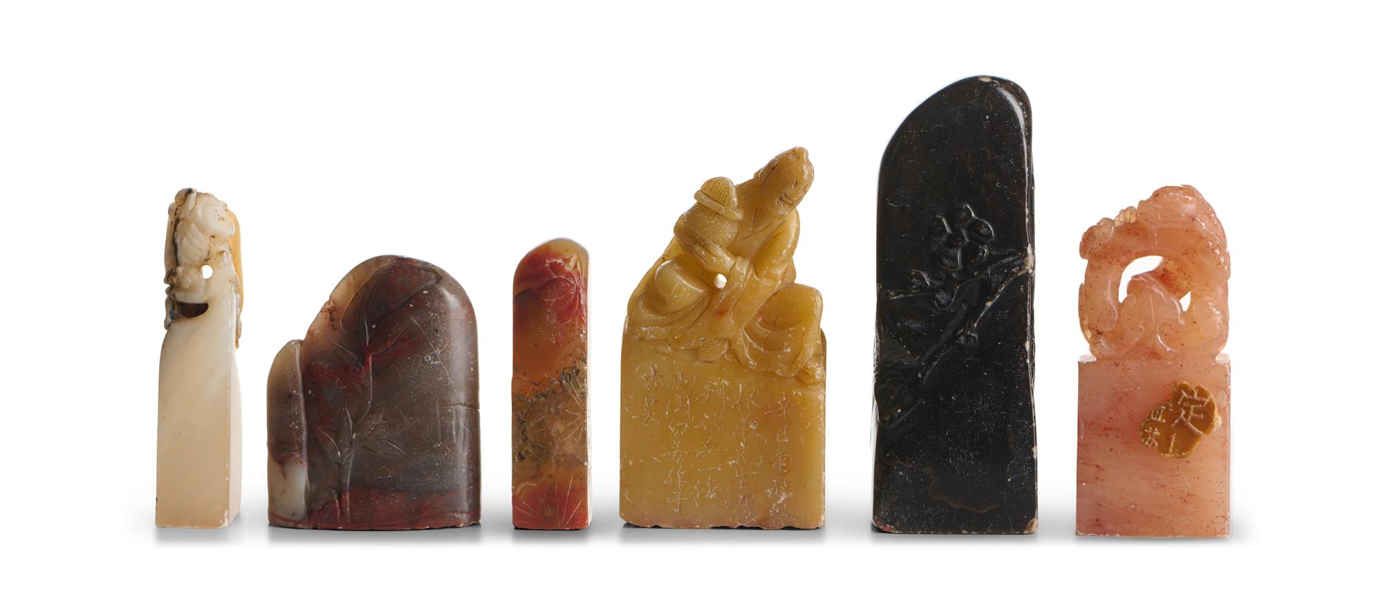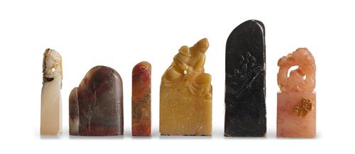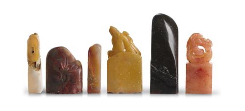 Comprising: a larger dark brown seal with relief carved prunus, and a nine character mark to the base; an inscribed yellow stone seal with a male figure and a four character mark to the base; a pink stone seal with qilong decoration; a chicken's blood stone seal in the form of a bamboo segment with a four character mark to the base; a yellow and white stone seal with low relief lotus carving and a four character mark to the base; and a white and yellow stone seal decorated with a qilong and coin with a three character mark to the base.