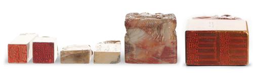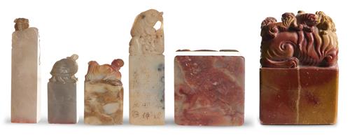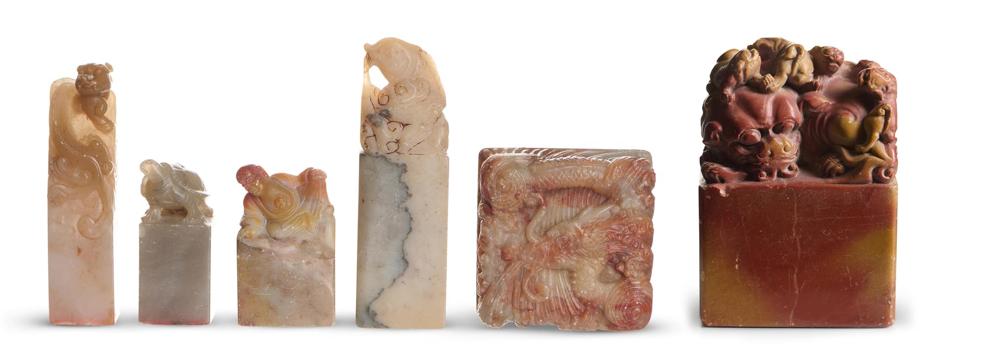 Comprising a large red and grey stone dragon decorated seal; a grey stone turtle decorated seal with four character mark to base; a brown and red stone seal with a drunken sage decoration; a white and pale brown qilong decorated seal with three character mark to base; an inscribed grey stone seal with leaping carp decoration; and a large pink and brown stone seal with guardian lion and cub decoration with a twelve character mark to base and a fitted cloth-covered box.
