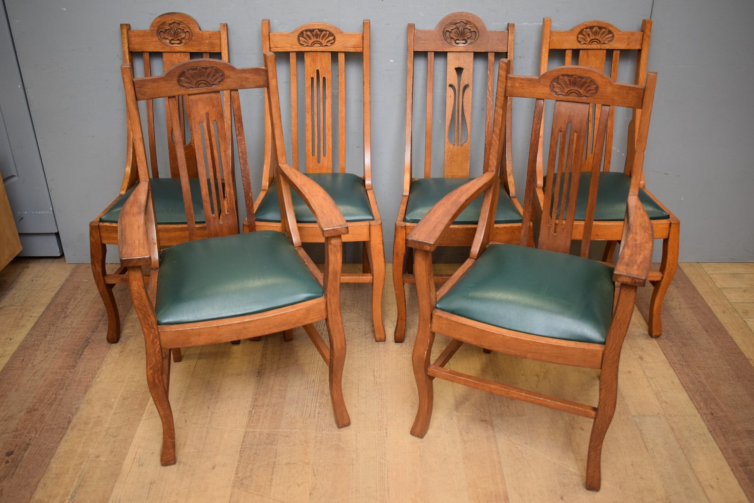 A SET OF SIX TIMBER DINING CHAIRS WITH LEATHER SEATS (A/F) (101H x 57W x 55D CM) (LEONARD JOEL DELIVERY SIZE: LARGE)