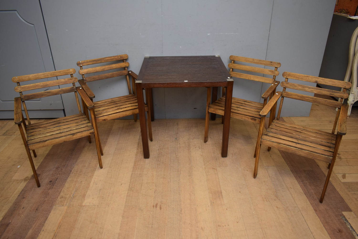 A FIVE PIECE OUTDOOR SETTING (A/F) (TABLE 76H x 79W x 79D CM) (PLEASE NOTE THIS HEAVY ITEM MUST BE REMOVED BY CARRIERS AT THE CUSTOMER'S EXPENSE. LEONARD JOEL STAFF CANNOT ASSIST CARRYING THIS ITEM) (X-LARGE ITEM)