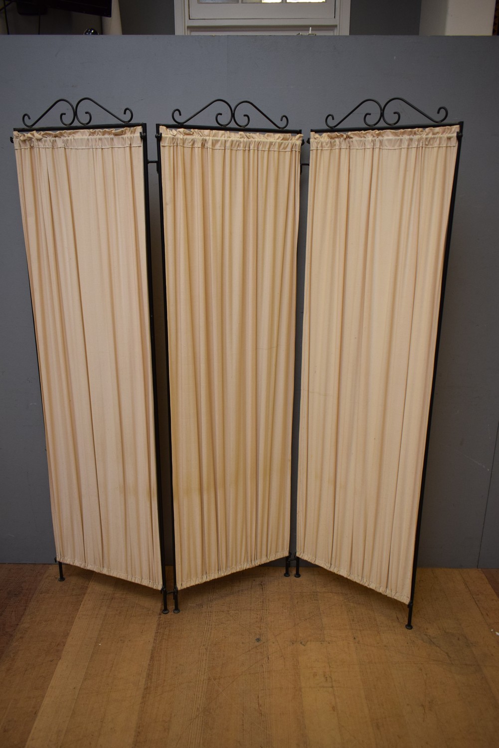 A THREE PANEL METAL AND CANVAS PRIVACY SCREEN (EACH PANEL 189 X 52) (LEONARD JOEL DELIVERY SIZE: MEDIUM)