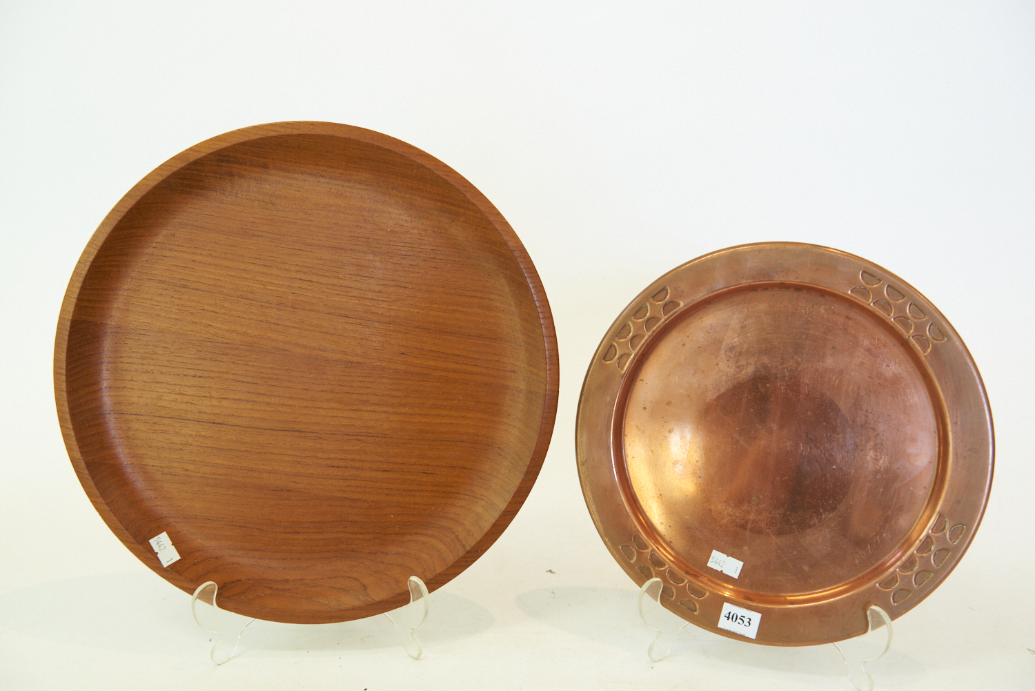 TWO TRAYS - ONE SCANDINAVIAN TEAK, THE OTHER EMBOSSED COPPER DIA.35CM, LEONARD JOEL LOCAL DELIVERY SIZE: SMALL