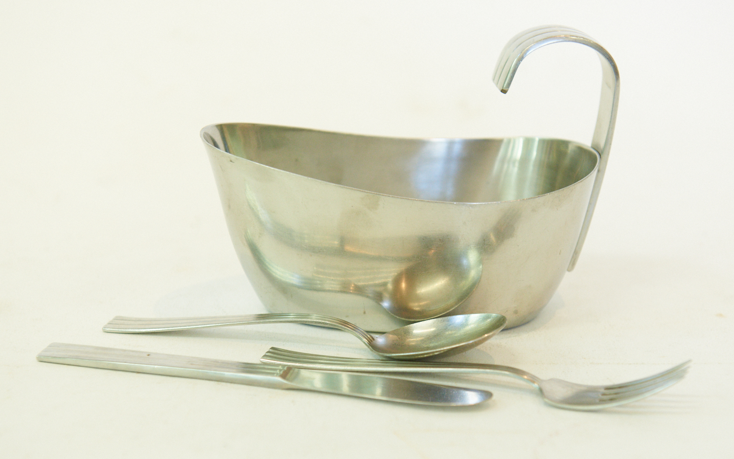 A MID-CENTURY CHILDREN'S CUTLERY SET TOGETHER WITH SAUCE BOAT - GENSE SWEDEN, LEONARD JOEL LOCAL DELIVERY SIZE: SMALL