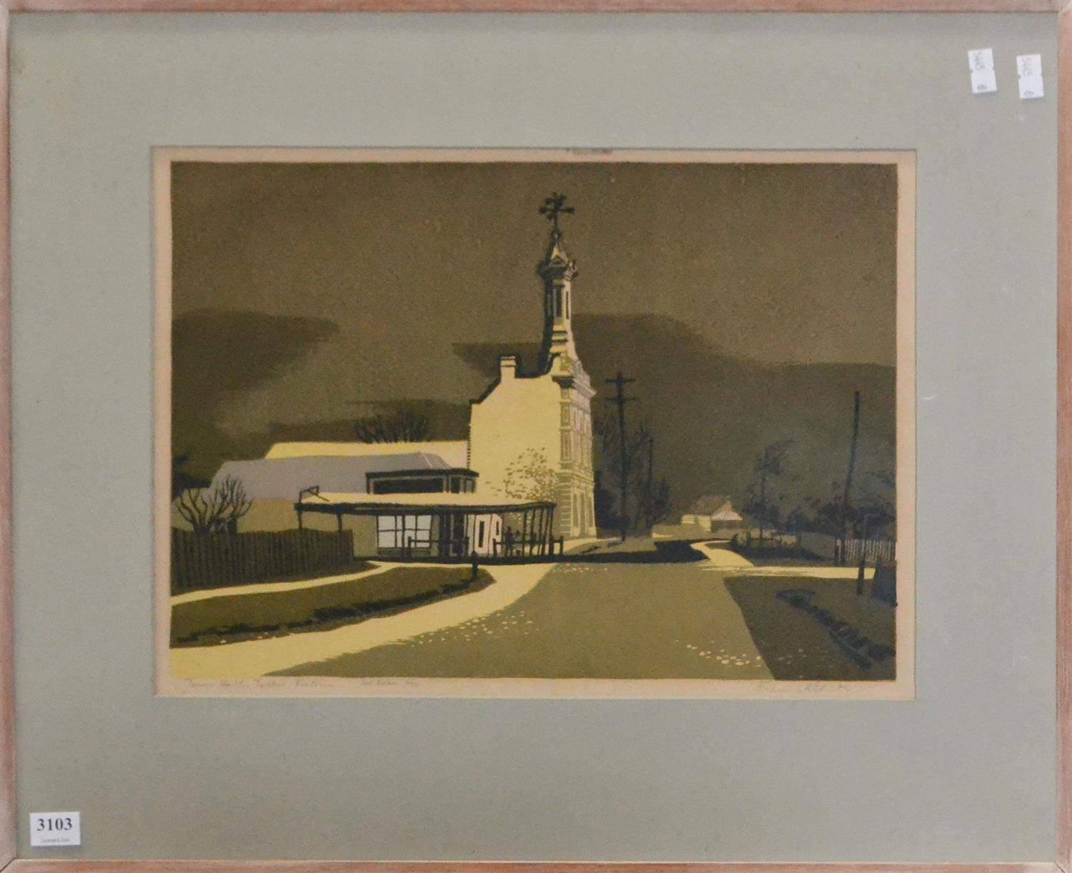 KENNETH JACK, TOWN HALL, TALBOT, VIC, LINOCUT 6/30, 27 X 37CM, FRAME SIZE: 48 X 57CM, LEONARD JOEL DELIVERY SIZE: MEDIUM