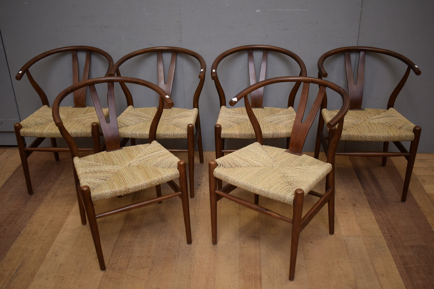 SIX TEAK WISHBONE STYLE CHAIRS IN WALNUT FINISH (A/F) (75H x 49W x 62D CM) (LEONARD JOEL DELIVERY SIZE: LARGE)