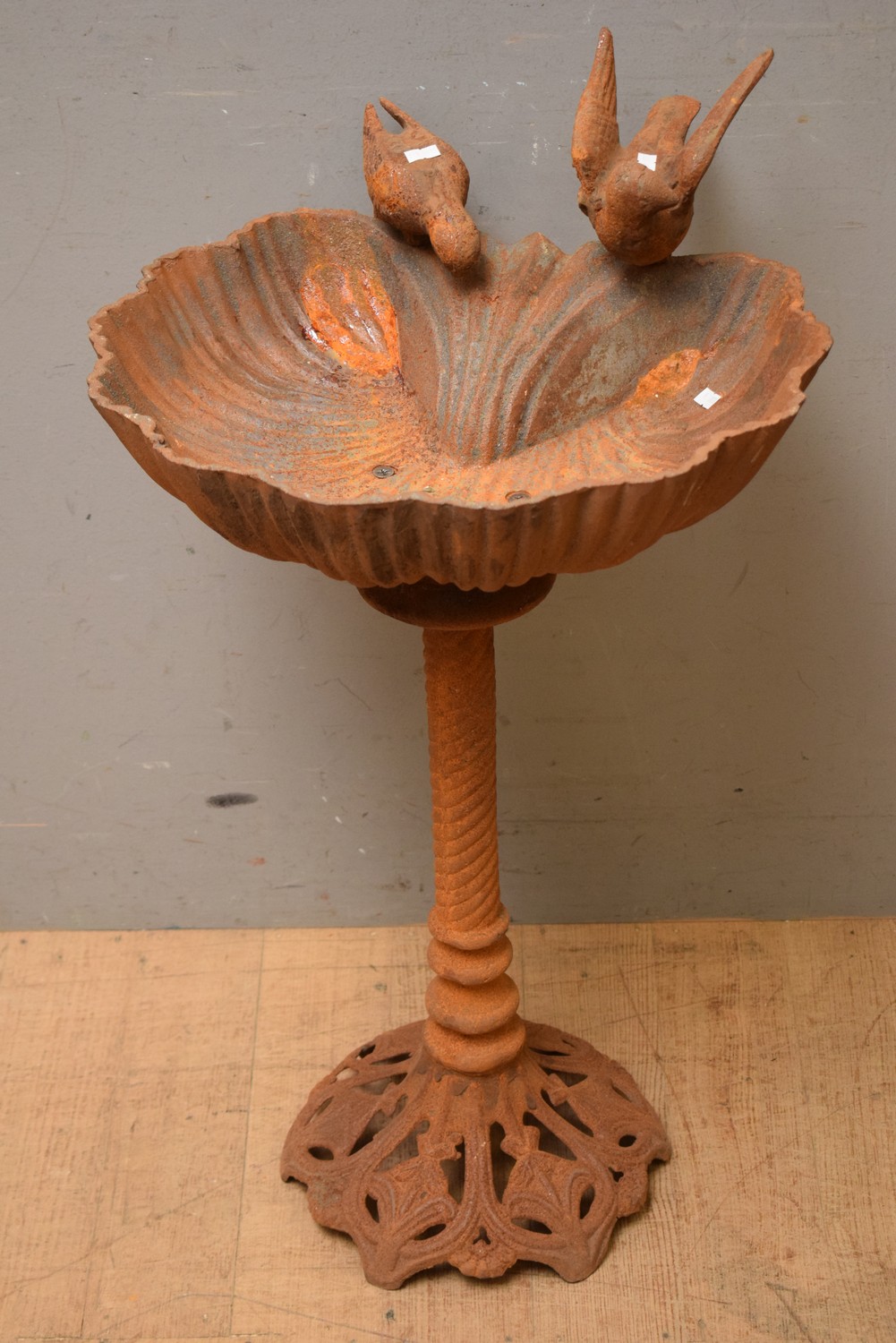 AN ORNATE CAST IRON BIRD BATH (A/F) (H82 X W45 X D50 CM) (LEONARD JOEL DELIVERY SIZE: LARGE)