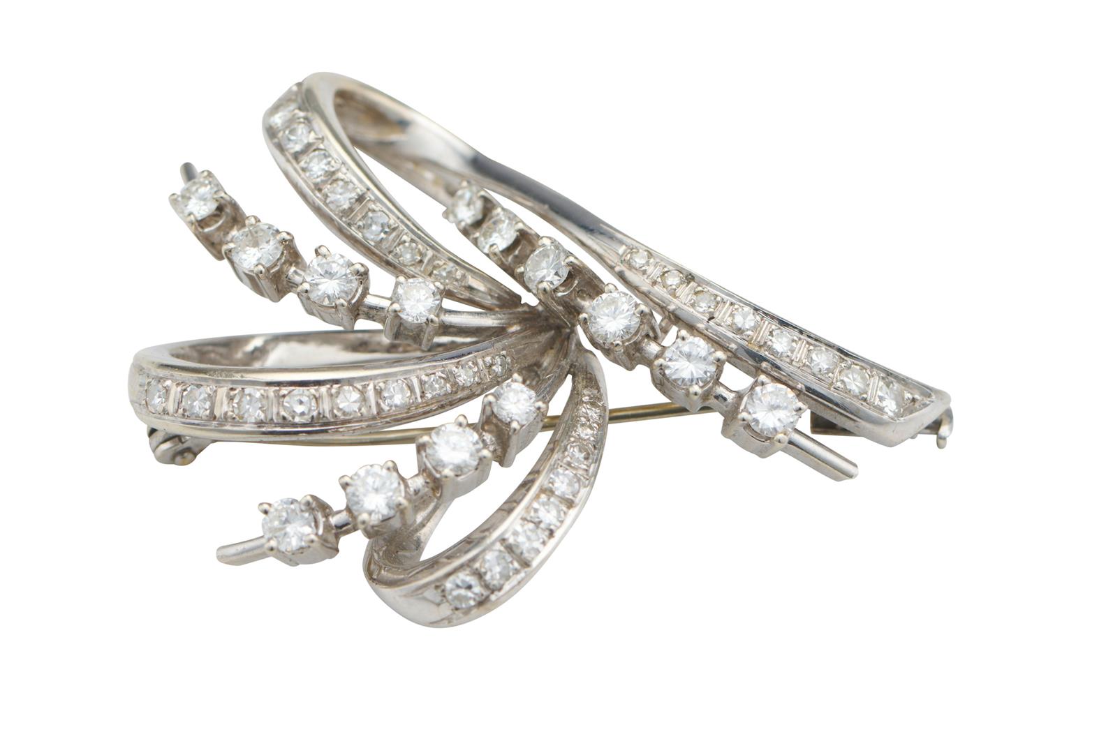 A 14CT WHITE GOLD AND DIAMOND BROOCH OF SPRAY DESIGN, SET WITH FORTY-SEVEN ROUND BRILLIANT-CUT DIAMONDS TOTALLING AN ESTIMATED 2.00 CARATS, LENGTH APPROXIMATELY 48MM
