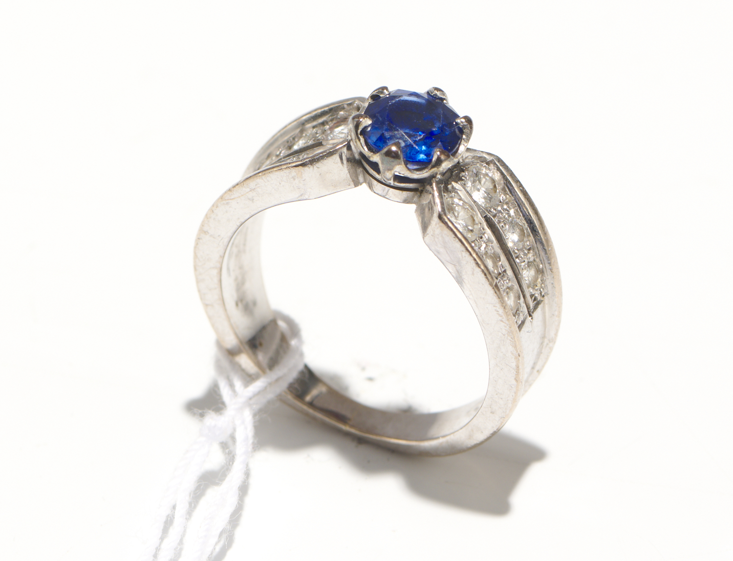 A DIAMOND AND SAPPHIRE RING IN 18CT WHITE GOLD, SIZE O, 7.4GMS