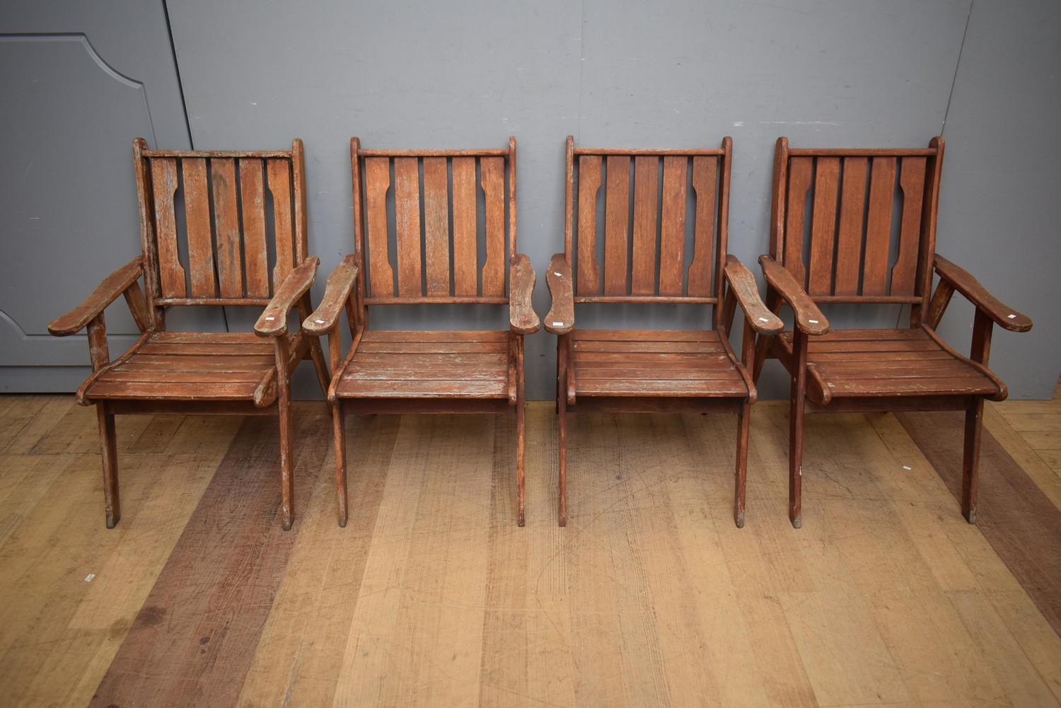 A SET OF FOUR TEAK OUTDOOR ARMCHAIRS (94H x 62W x 68D CM) (PLEASE NOTE THIS HEAVY ITEM MUST BE REMOVED BY CARRIERS AT THE CUSTOMER'S EXPENSE. LEONARD JOEL STAFF CANNOT ASSIST CARRYING THIS ITEM) (X-LARGE ITEM)