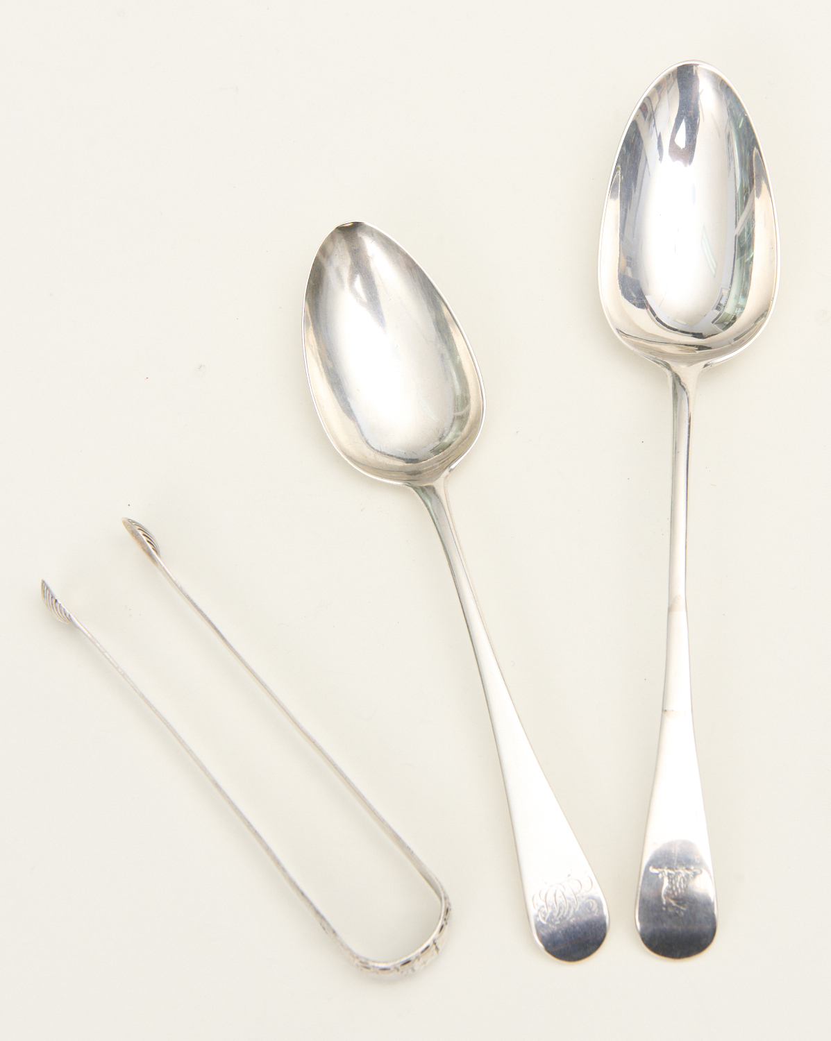 Comprising a monogrammed dessert spoon by William Eley and William Fearn, London, a serving spoon by Richard Crossley, London, and sugar tongs by Samuel Godbehere and Edward Wigan, London