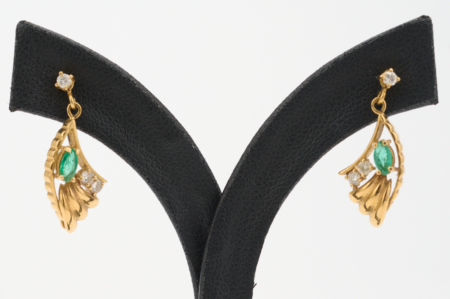 A PAIR OF EMERALD AND DIAMOND EARRINGS IN 18CT GOLD, TO POST AND BUTTERFLY EARRINGS.