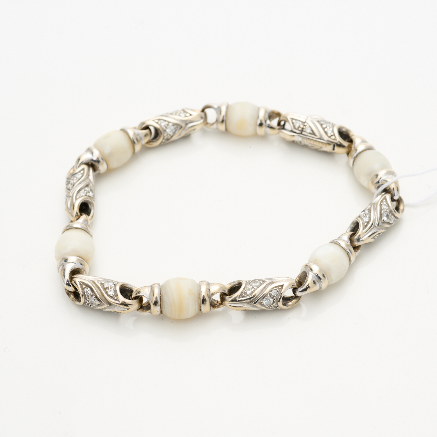A PEARL AND DIAMOND SET'PASSO DOPPIO' BRACELET IN 18CT WHITE GOLD BY BULGARI, COMPRISING CULTURED PEARLS SPACED BY ROUNDED BATON LINKS, DETAILED WITH ROUND BRILLIANT-CUT DIAMONDS, LENGTH APPROXIMATELY 185MM, SIGNED BULGARI