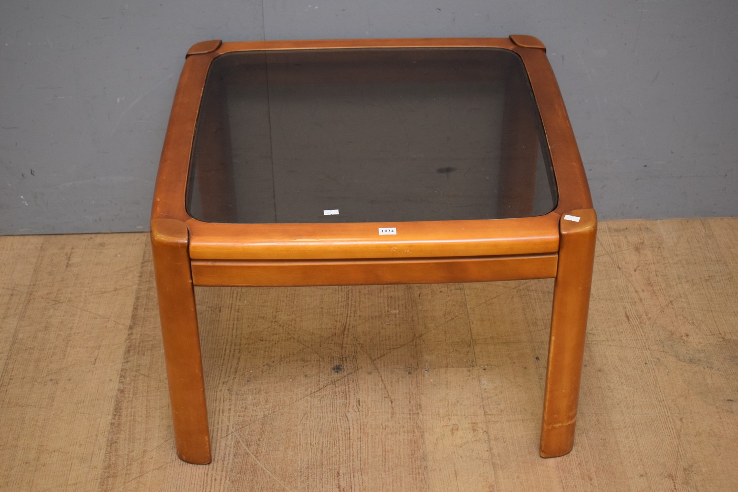 A MID-CENTURY GLASS TOPPED COFFEE TABLE (45H x 68W x 68D CM) (LEONARD JOEL DELIVERY SIZE: MEDIUM)