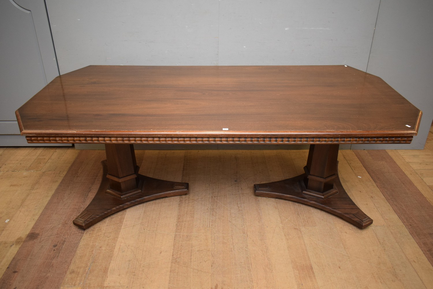 A SOLID MAHOGANY DINING TABLE (A/F) (74H x 215W x 106D CM) (PLEASE NOTE THIS HEAVY ITEM MUST BE REMOVED BY CARRIERS AT THE CUSTOMER'S EXPENSE. LEONARD JOEL STAFF CANNOT ASSIST CARRYING THIS ITEM) (X-LARGE ITEM)