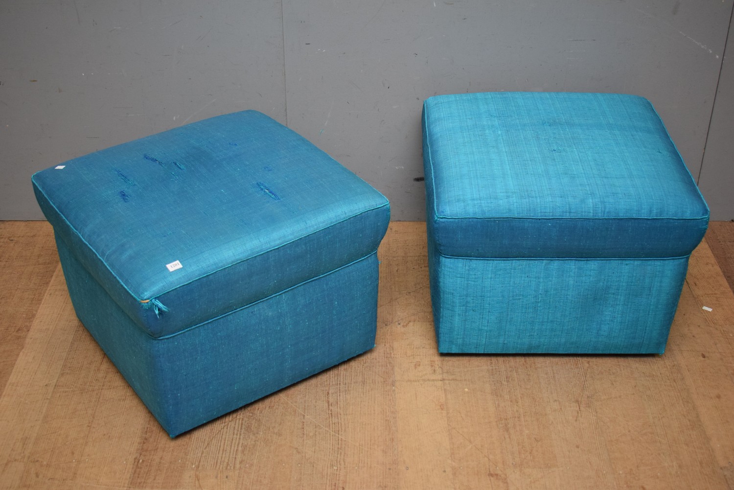 A PAIR OF BLUE SATIN OTTOMANS (A/F) (46H x 58W x 58D CM) (LEONARD JOEL DELIVERY SIZE: MEDIUM)