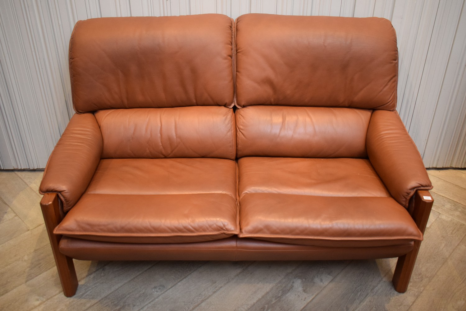 A 1970S TAN LEATHER TWO SEAT SOFA (88H x 148W x 90D CM) (PLEASE NOTE THIS HEAVY ITEM MUST BE REMOVED BY CARRIERS AT THE CUSTOMER'S EXPENSE. LEONARD JOEL STAFF CANNOT ASSIST CARRYING THIS ITEM) (X-LARGE ITEM)