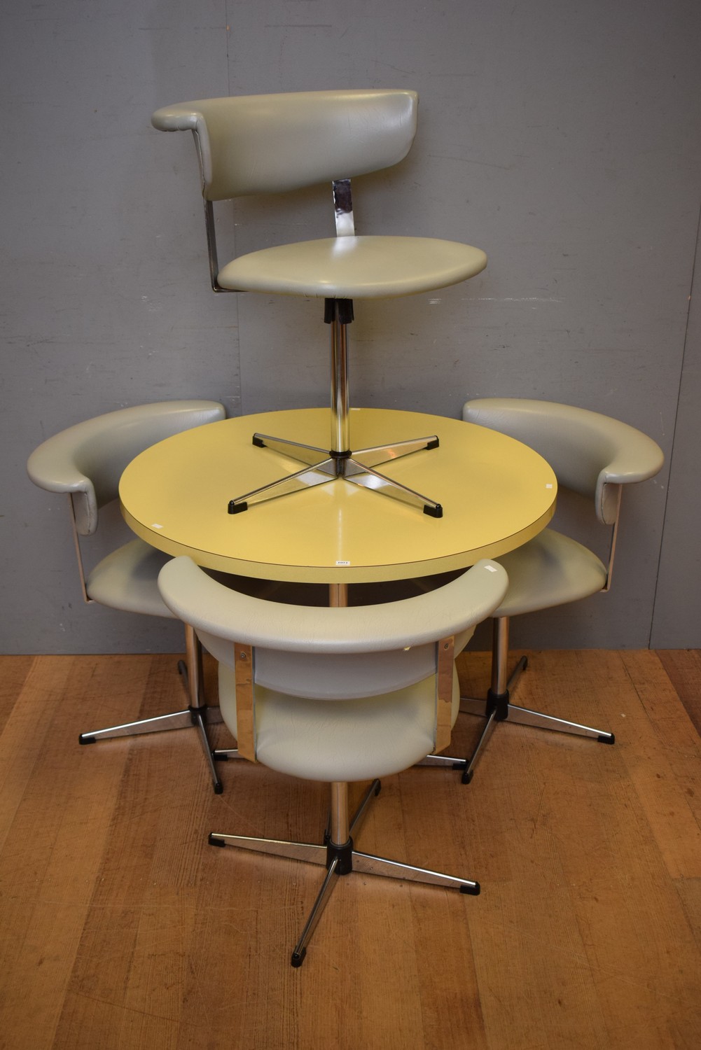 A FIVE PIECE 1970S KITCHEN SETTING OF TABLE AND FOUR CHAIRS (TABLE 73H x 82D CM) (PLEASE NOTE THIS HEAVY ITEM MUST BE REMOVED BY CARRIERS AT THE CUSTOMER'S EXPENSE. LEONARD JOEL STAFF CANNOT ASSIST CARRYING THIS ITEM) (X-LARGE ITEM)