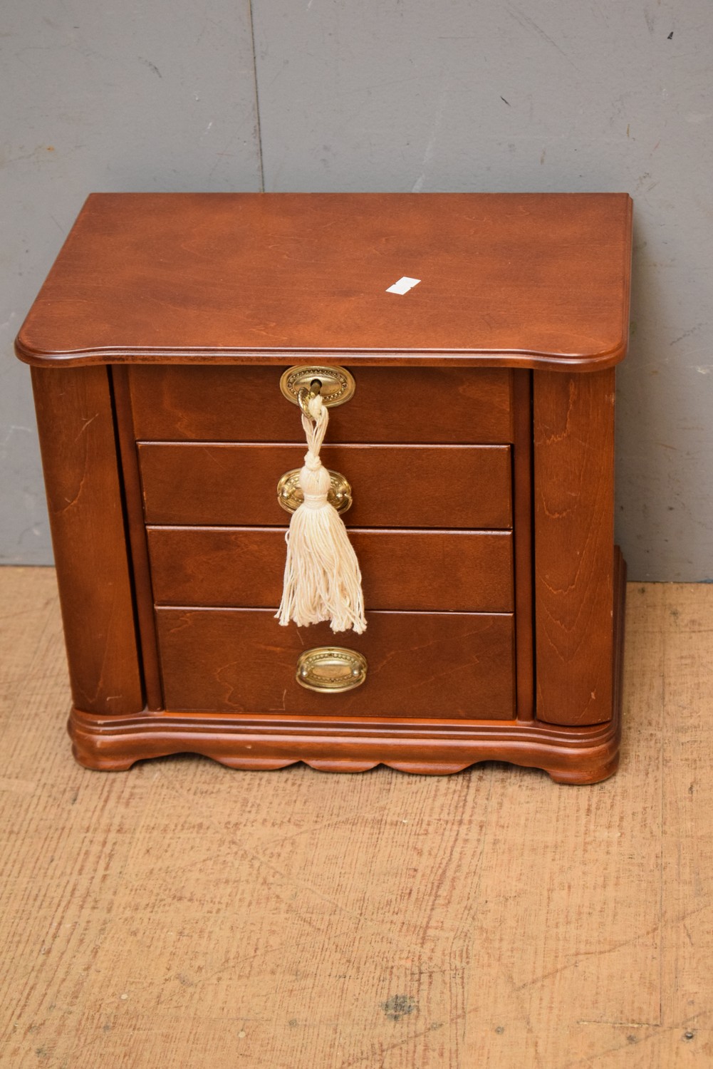 A FOUR DRAWER MAHOGANY JEWELLERY BOX (H30 X W36 X D23 CM) (LEONARD JOEL DELIVERY SIZE: SMALL)