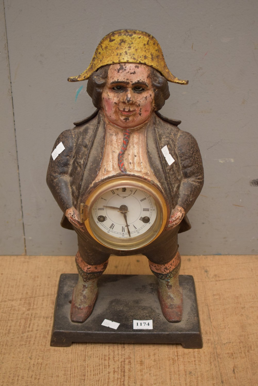 A 'JOHN BULL' CAST METAL FIGURE WITH CLOCK (A/F) (42 H CM) (LEONARD JOEL DELIVERY SIZE: MEDIUM)