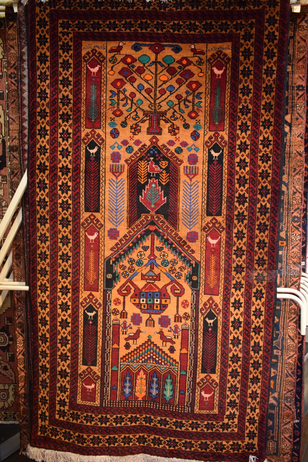 A VERY PRETTY AND COLOURFUL TRIBAL PERSIAN SANGUN BALOUCH RUG, 100% WOOL. HAND-KNOTTED TRIBAL WEAVE.MIHRAB DESIGN CONTAINING BIRD FORM AND CAUCASIAN MEDALLION. TREE OF LIFE DESIGN WITH MAIN BORDER OF CYPRESS TREES.MINOR BORDER OF FLOWER-HEADS. IN EXCELLENT CONDITION. CERTIFICATE OF AUTHENTICITY INCLUDED. SIZE: 197X105CM ORIGIN: PERSIA - RRP: $1,800